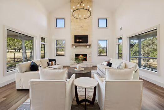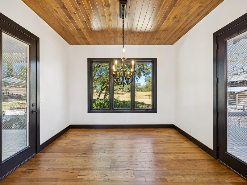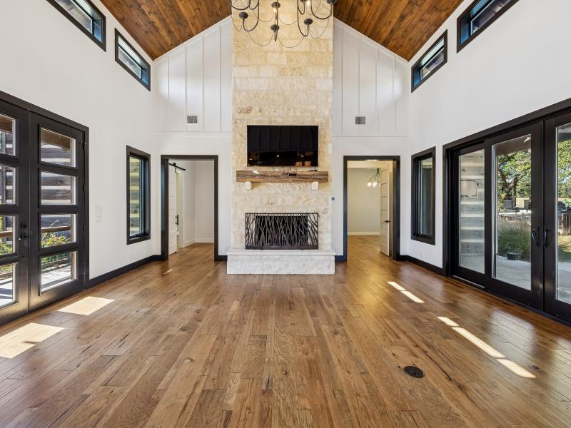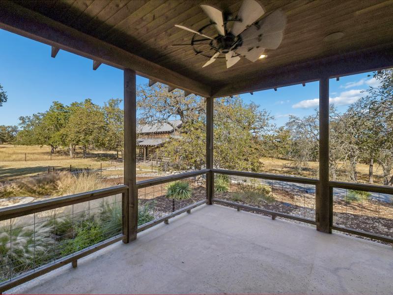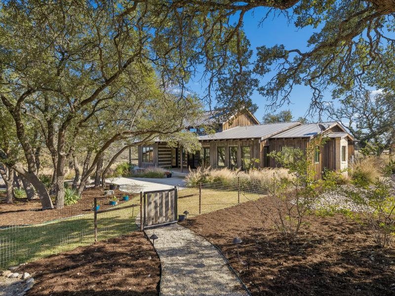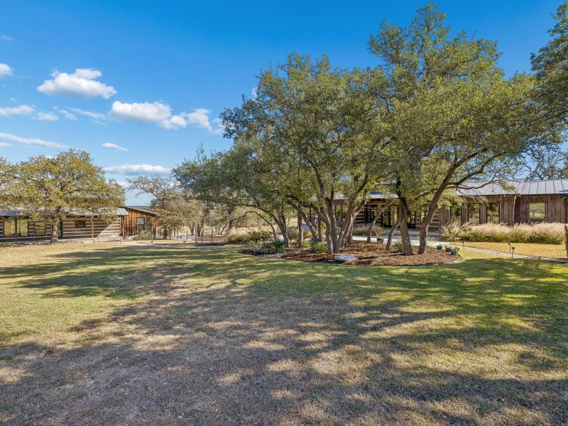 The 10-acre tract features mature hardwoods, groomed landscaping, and quiet natural corridors that enhance privacy and create an inviting outdoor environment. Fenced yard areas, multiple porches, and shaded seating spots blend seamlessly with the natural Hill Country setting.