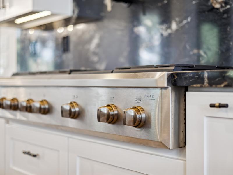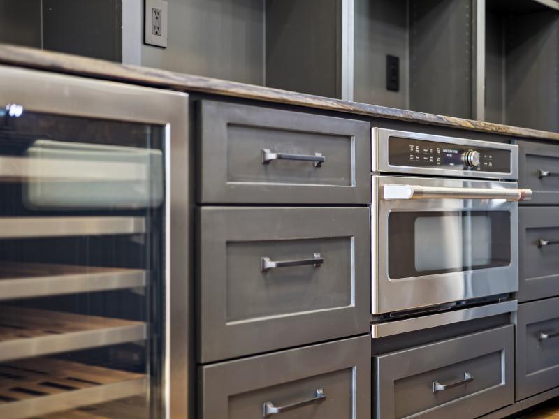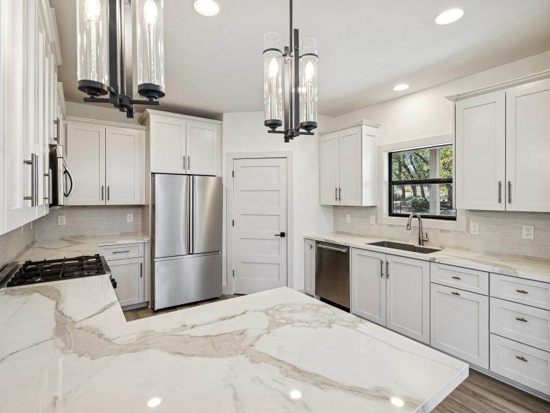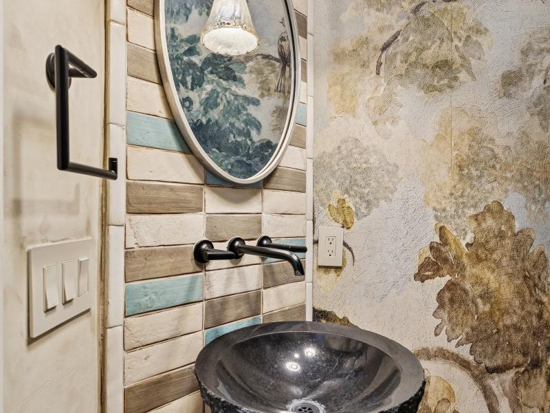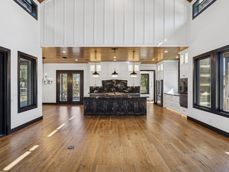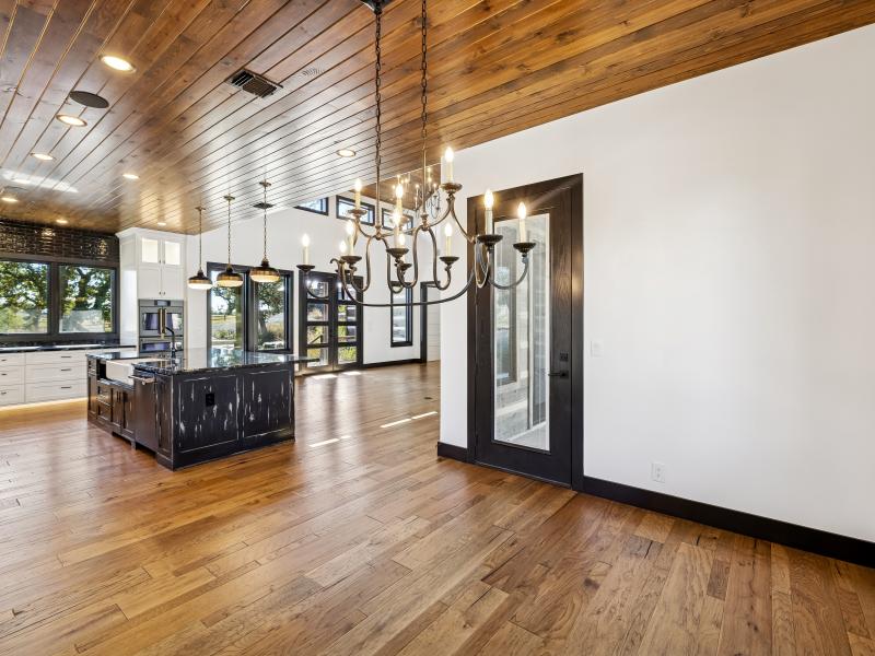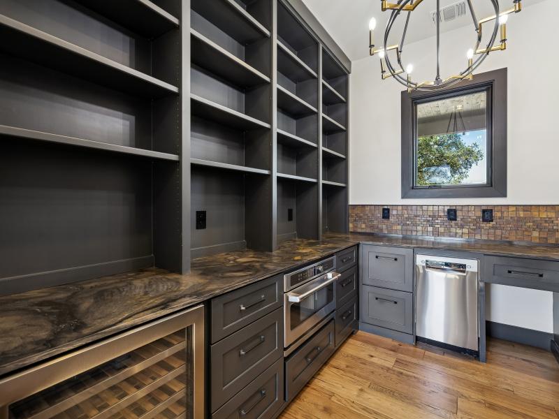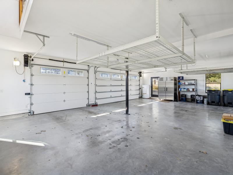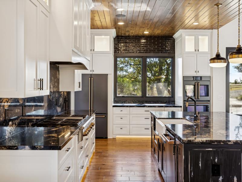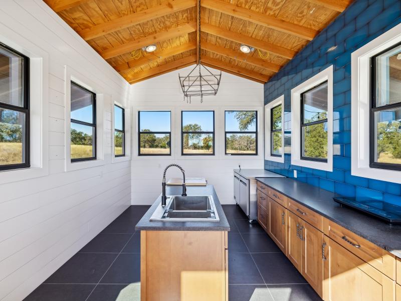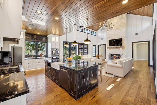 The 2,381-sq-ft main home includes 2 bedrooms, 2.5 baths, and a chef-designed kitchen complete with a 6-burner gas cooktop with griddle, French-door double oven, refrigerator/freezer, and island dishwasher. The large “dirty kitchen” expands prep and entertaining capacity with its own refrigerator/freezer, wine fridge, sink, speed oven/microwave, and second dishwasher. The great room showcases a floor-to-ceiling stone gas fireplace, wood ceilings, and large windows overlooking the backyard.