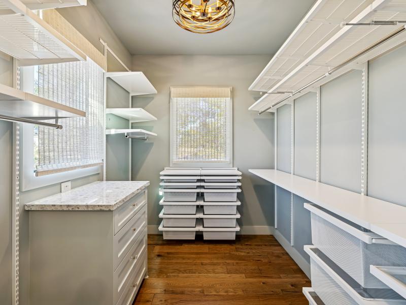 The primary suite offers abundant natural light, serene views, two walk-in closets, and a luxurious ensuite with double vanity and oversized walk-in shower. A private secondary bedroom includes its own ensuite and walk-in closet.