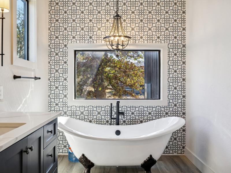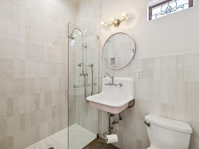 The 1,500-sq-ft guest house features 1 bedroom, 1 bath, a full kitchen, stacked-stone fireplace, and a versatile loft that doubles as a second bedroom or flex area. The bathroom includes a clawfoot tub with views of the property and a spacious shower.