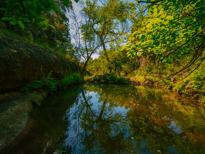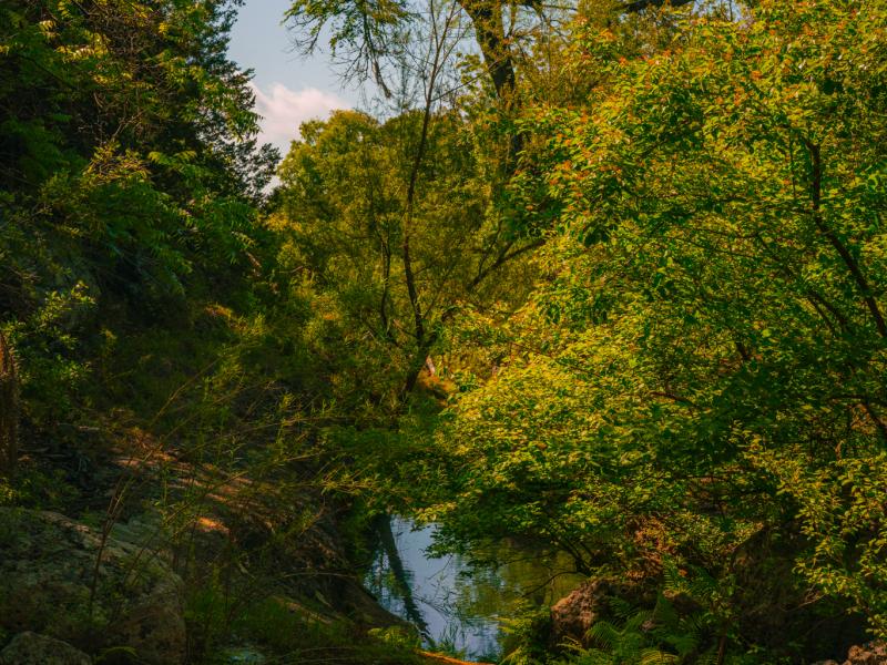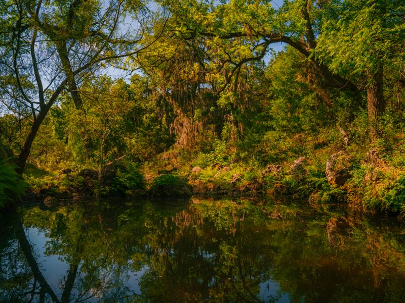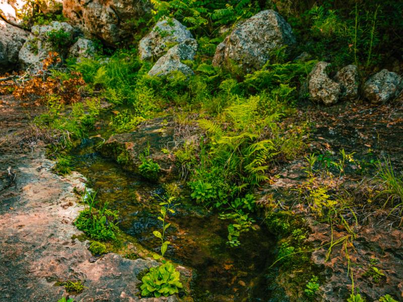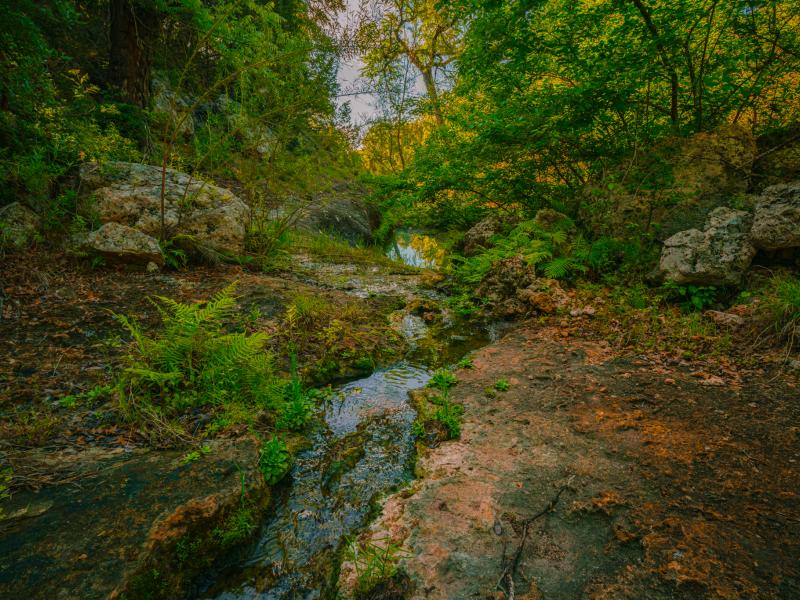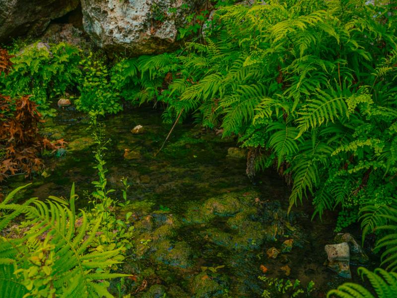 The land is rich with natural beauty and timeless Hill Country charm. A crystal-clear spring flows through ancient boulders into a tranquil pool, creating a striking focal point within the property. Mature heritage live oaks draped in Spanish moss, towering cedar elms, and lush native ferns provide shade, character, and habitat. The abundance of native wildlife further reinforces the sense of seclusion and connection to nature found throughout the ranch.