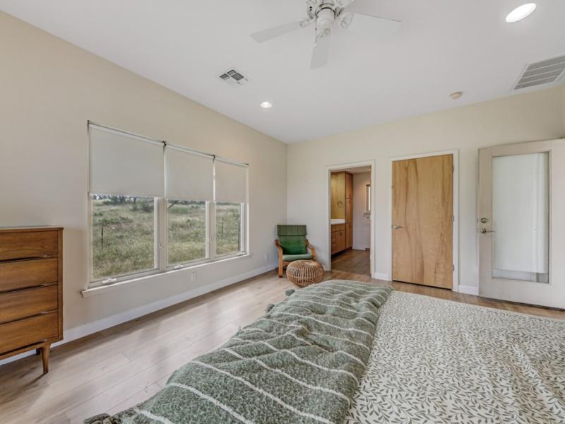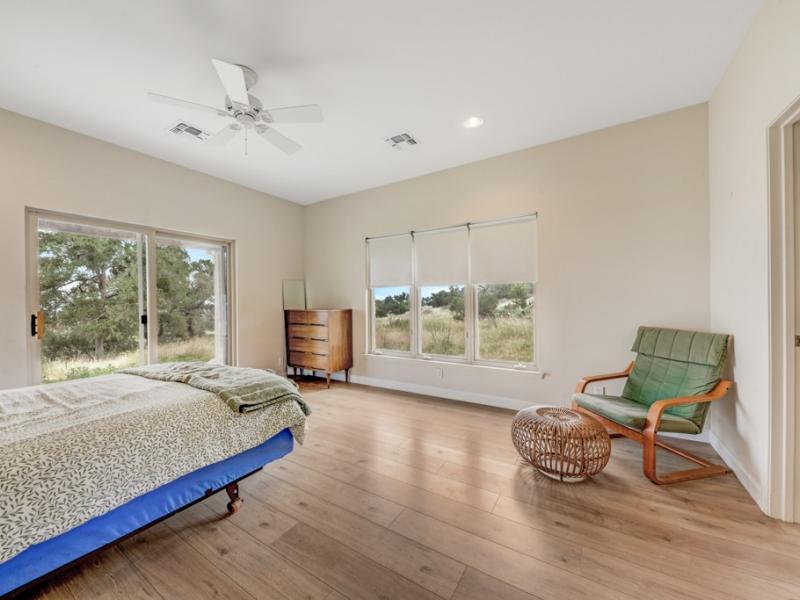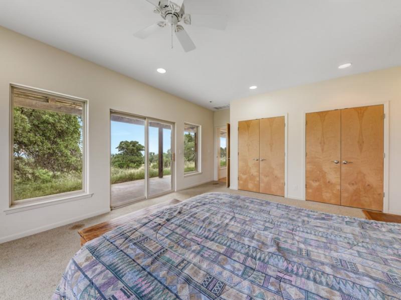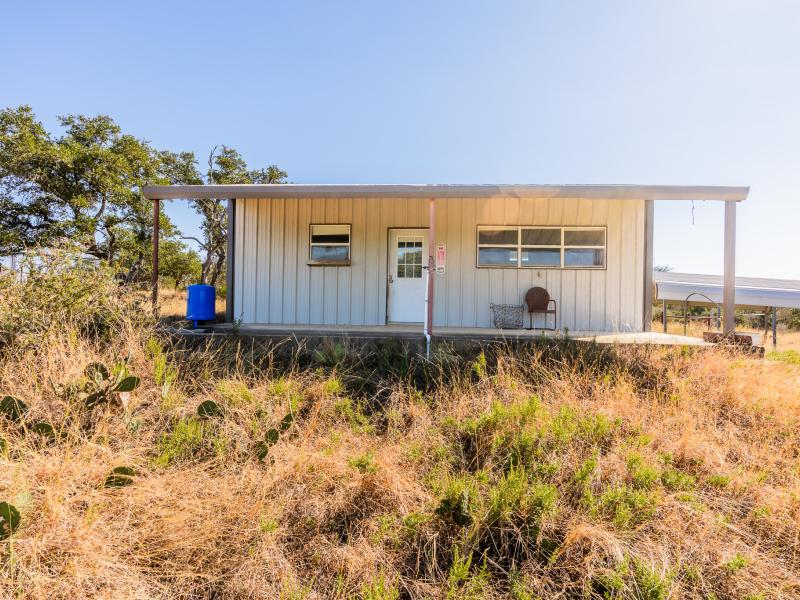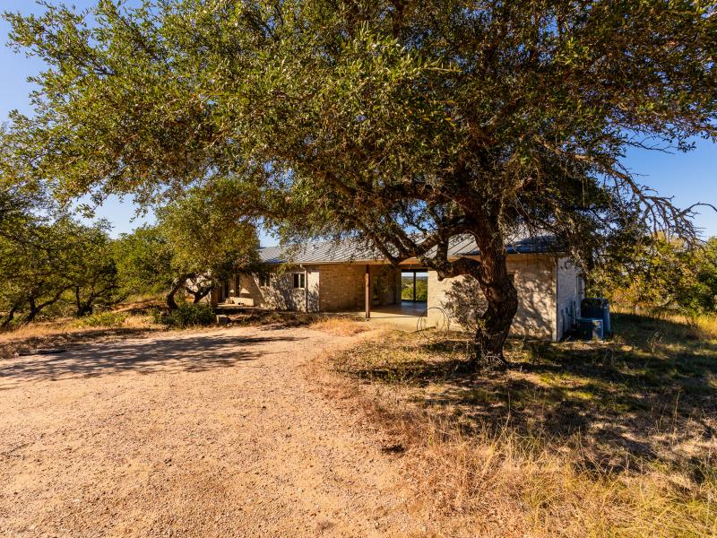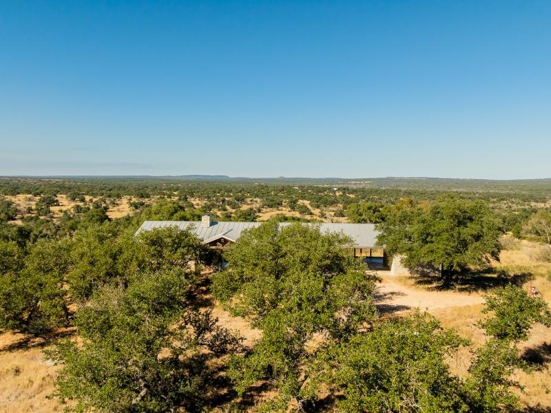 The primary residence is a comfortable two-bedroom, two-and-a-half-bath Hill Country home positioned to capture long-distance views and natural light across the rolling landscape.