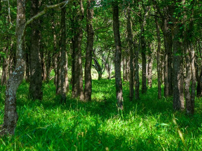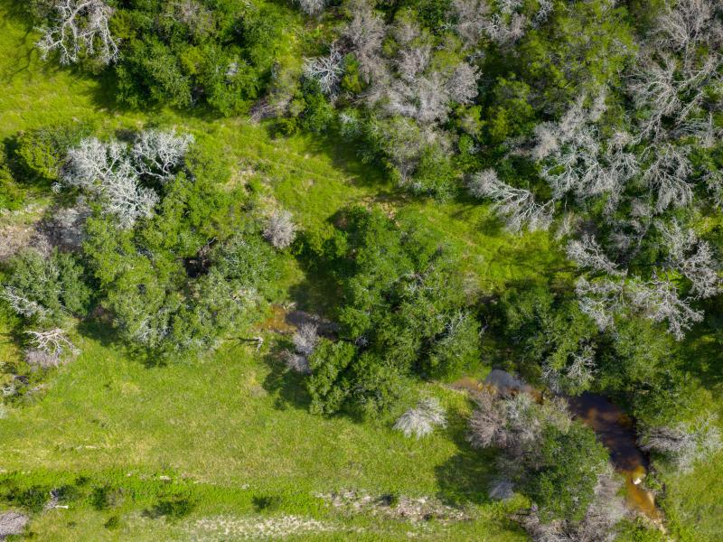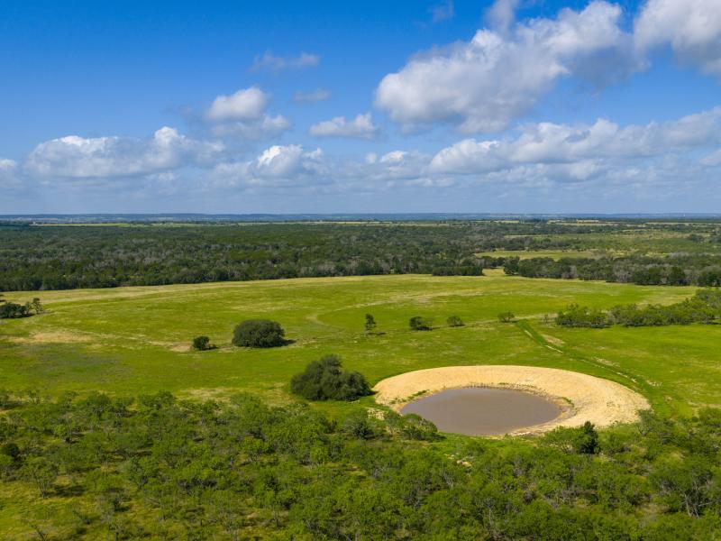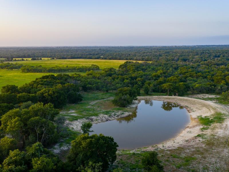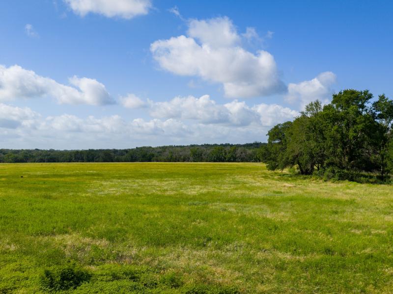The ranch features gently rolling topography with a healthy mix of open pasture and wooded areas that provide both grazing opportunities and natural wildlife cover. Productive grass pastures support cattle operations, while mature hardwoods scattered across the landscape create shade and shelter for livestock and wildlife alike.