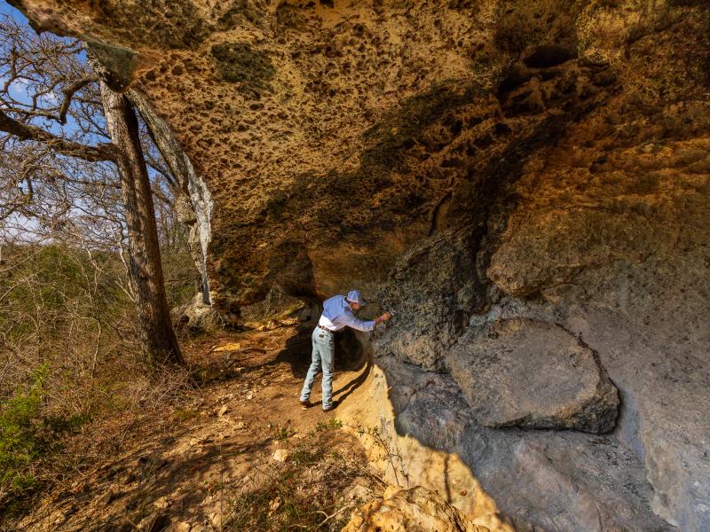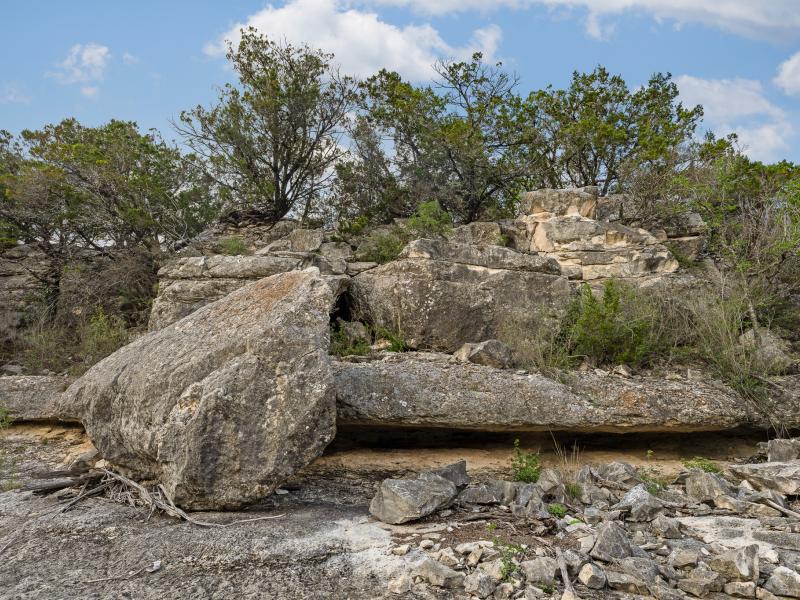 Elevated ridgelines provide outstanding building locations with long-range views, while the land transitions into a scenic creek valley defined by towering limestone bluffs, rock overhangs, and natural caves. Several of these formations are accessible, offering a rare and immersive experience within the landscape.