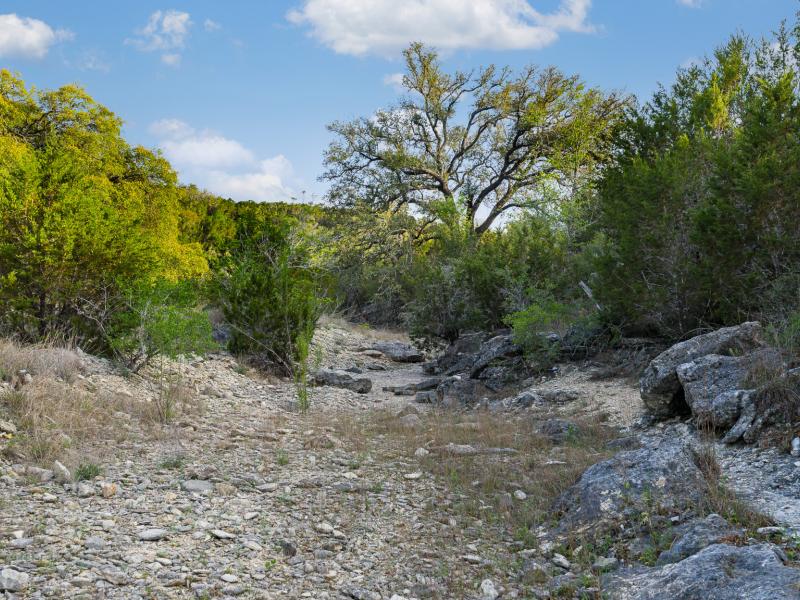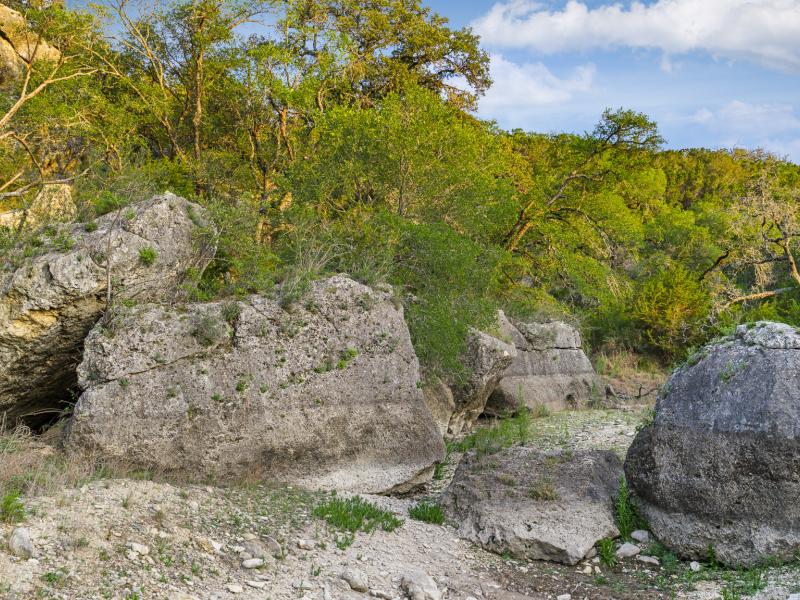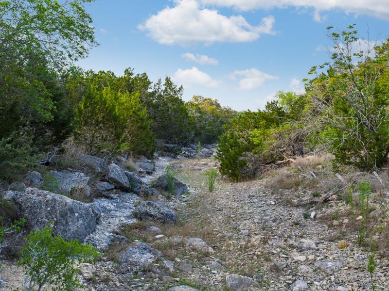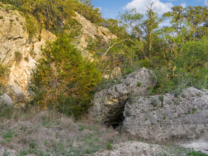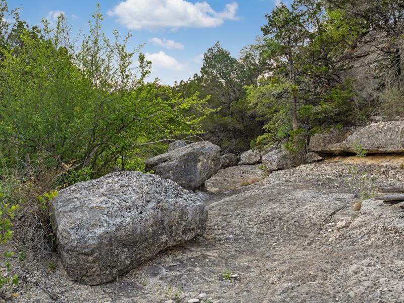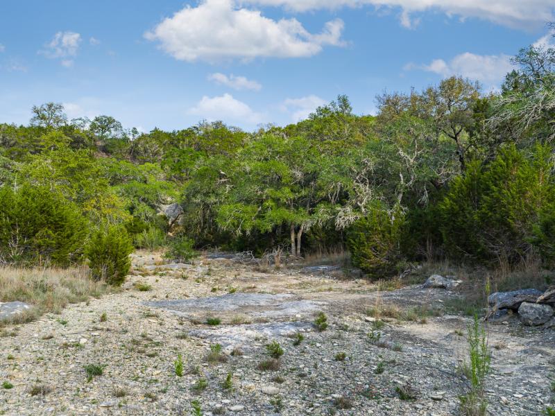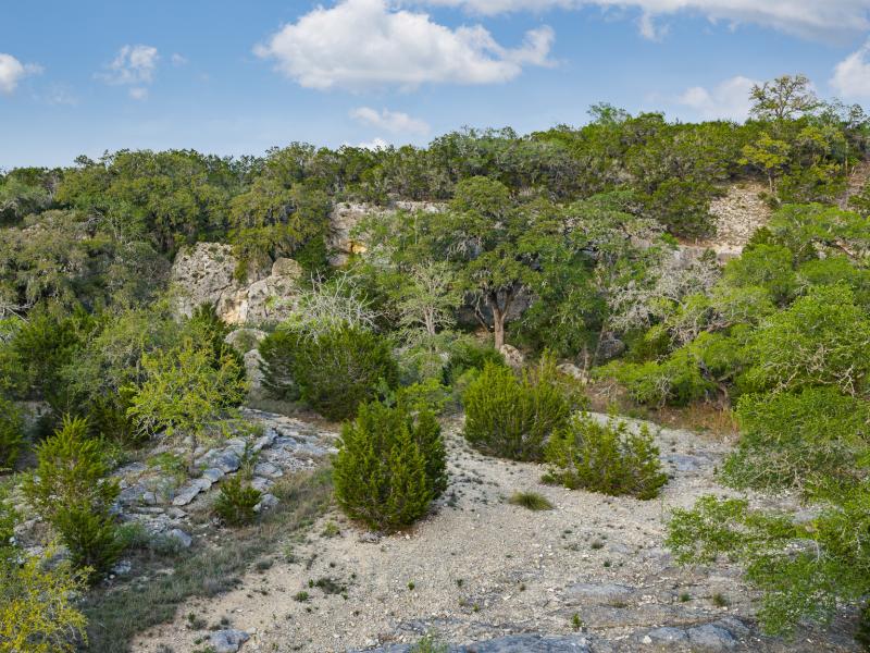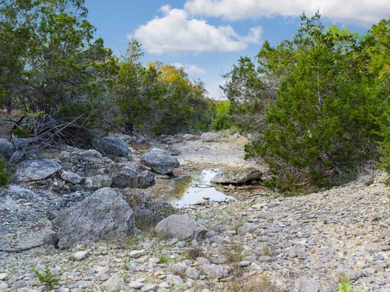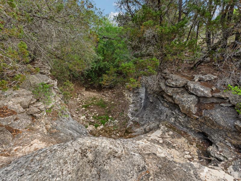A standout feature along the creek is a 10–13 foot deep grotto, historically spring-fed, which presents an opportunity for enhancement into a unique swimming hole. The surrounding bluffs, caves, and shaded banks create a setting that feels distinctly timeless and deeply connected to the Hill Country landscape.