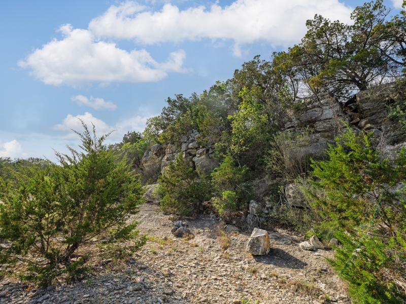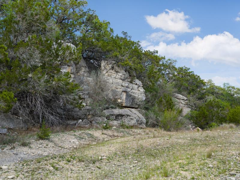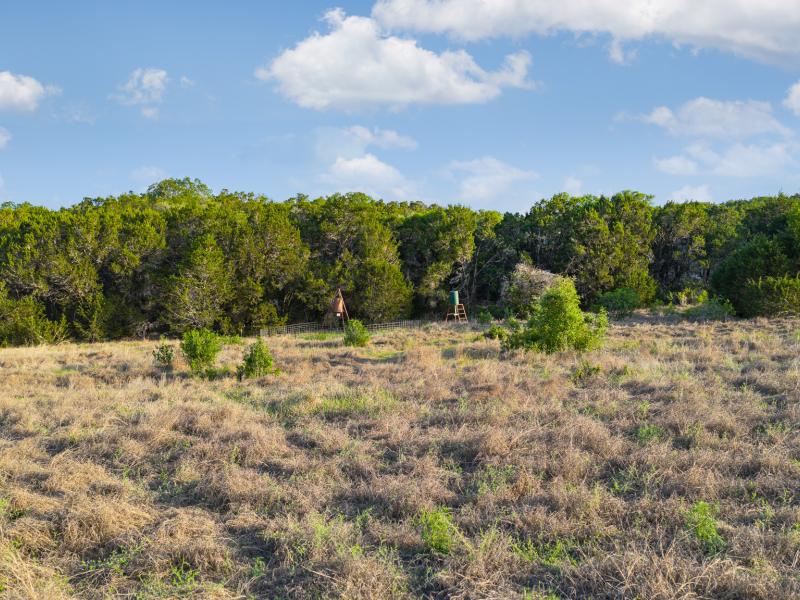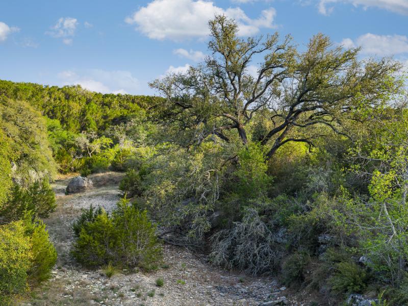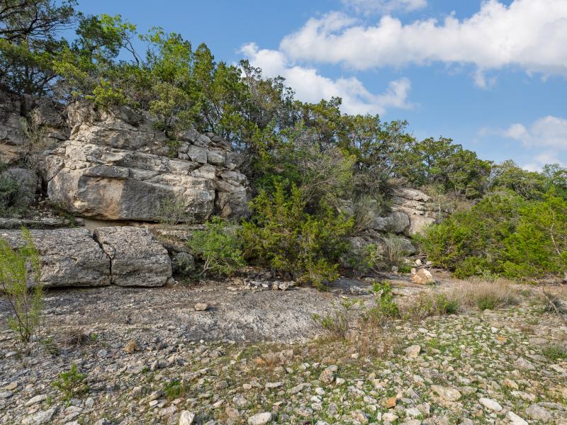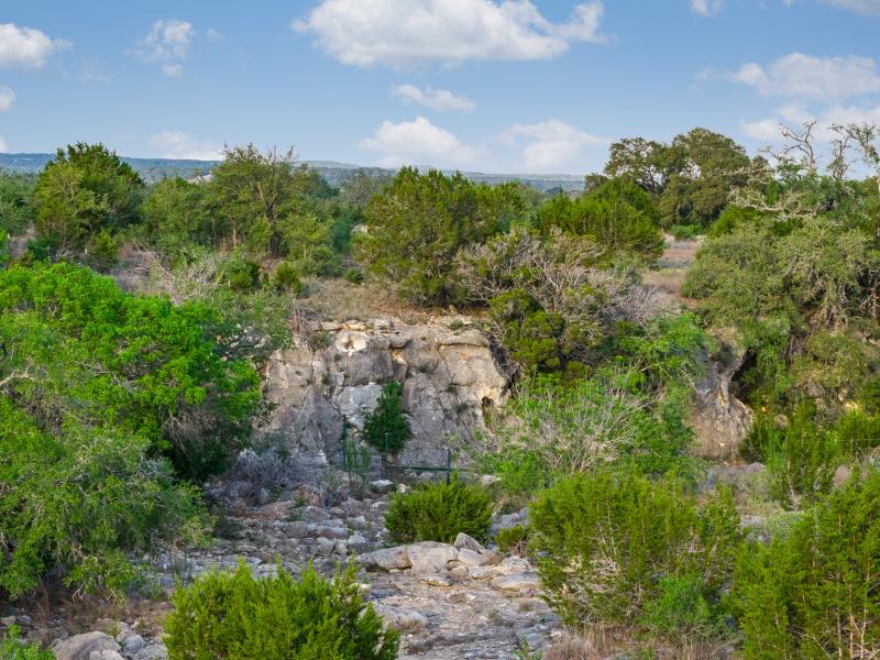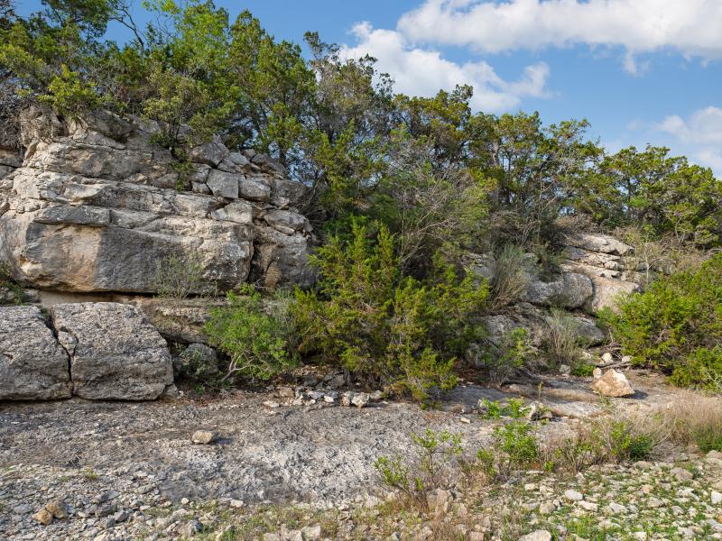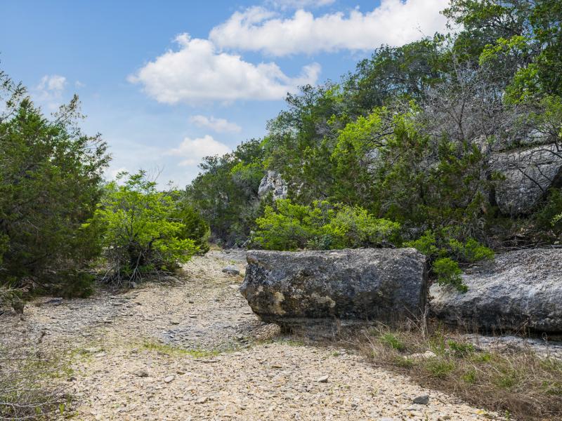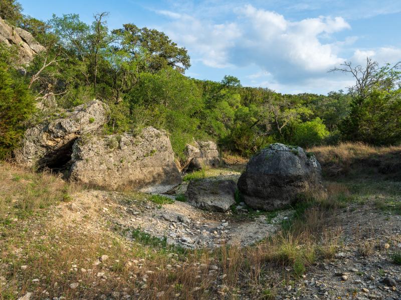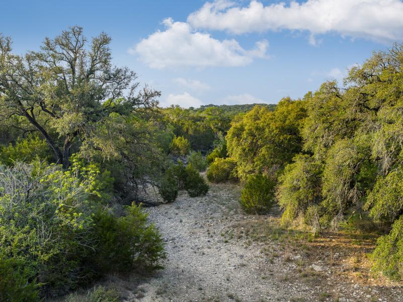 A standout feature along the creek is a 10–13 foot deep grotto, historically spring-fed, which presents an opportunity for enhancement into a unique swimming hole. The surrounding bluffs, caves, and shaded banks create a setting that feels distinctly timeless and deeply connected to the Hill Country landscape.