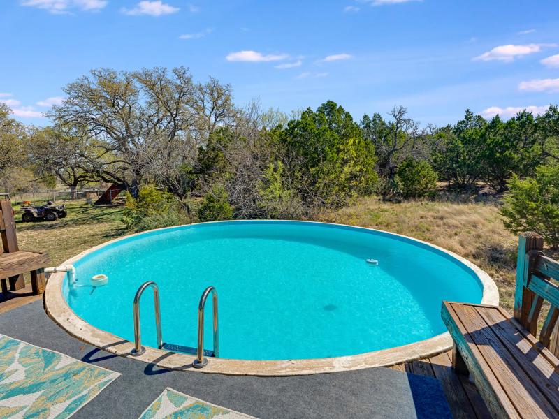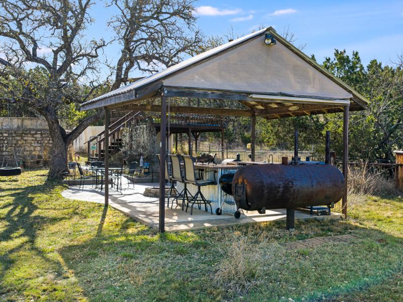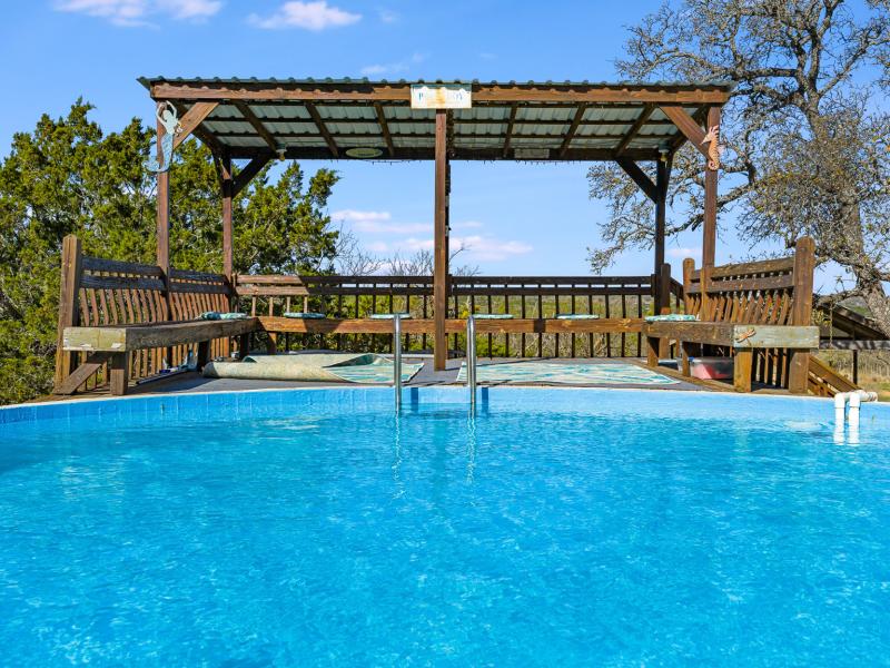Outdoor living is a key highlight, featuring a pila-style pool, a fully equipped outdoor kitchen with refrigerator and sink, and multiple spaces positioned to take in the surrounding Hill Country views.