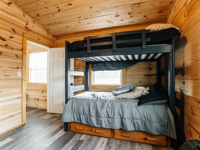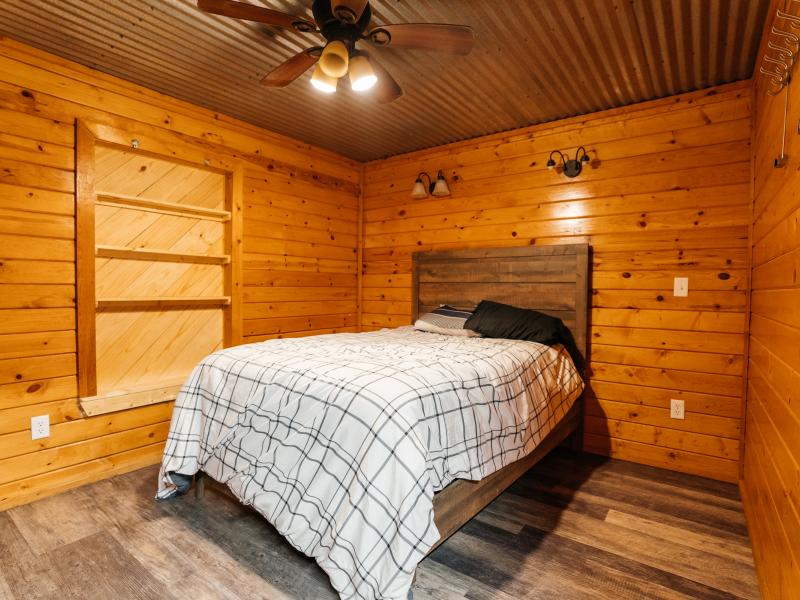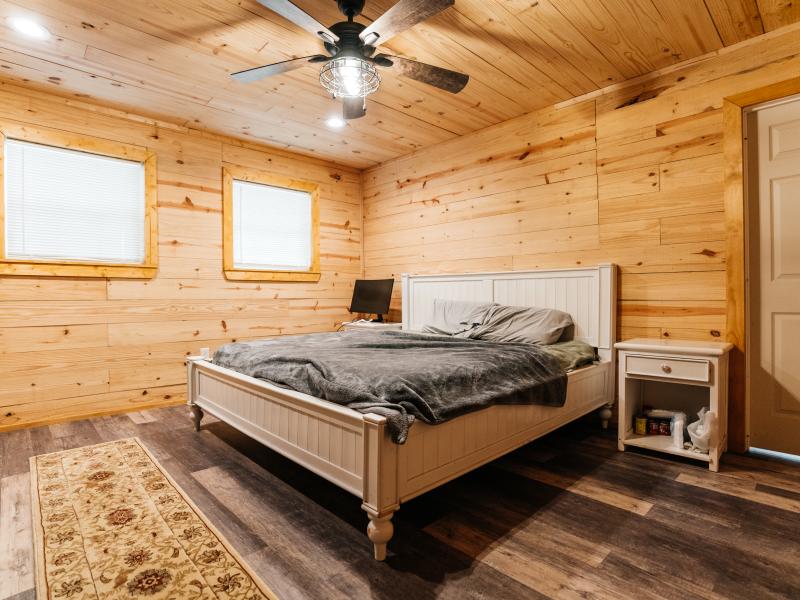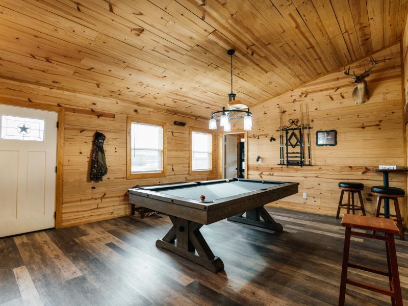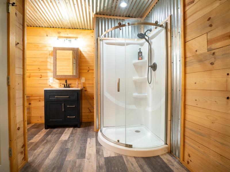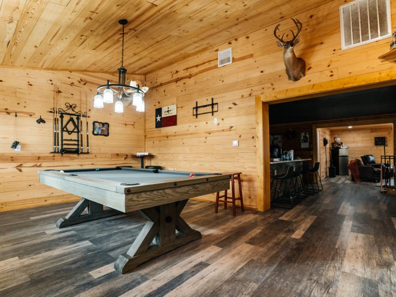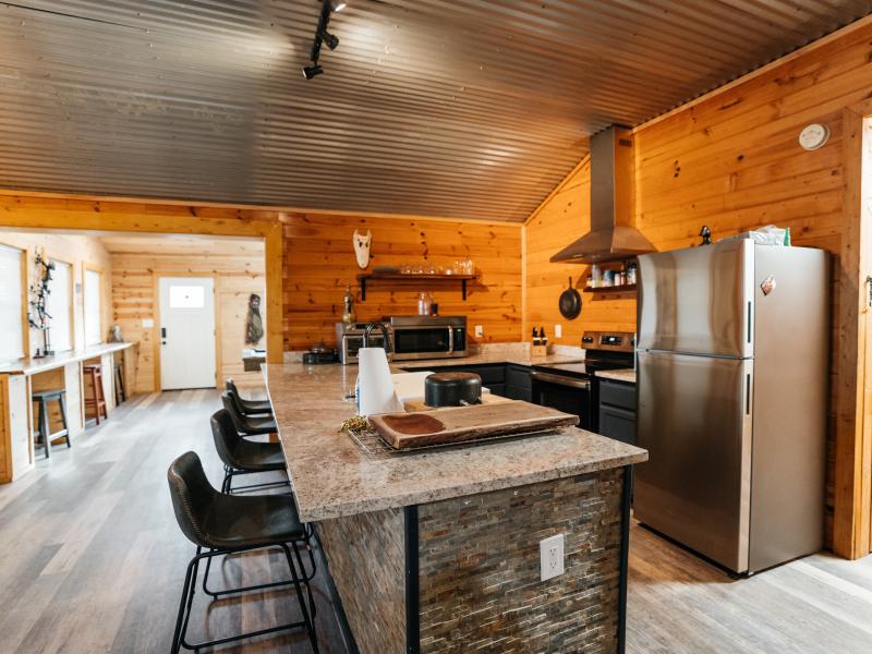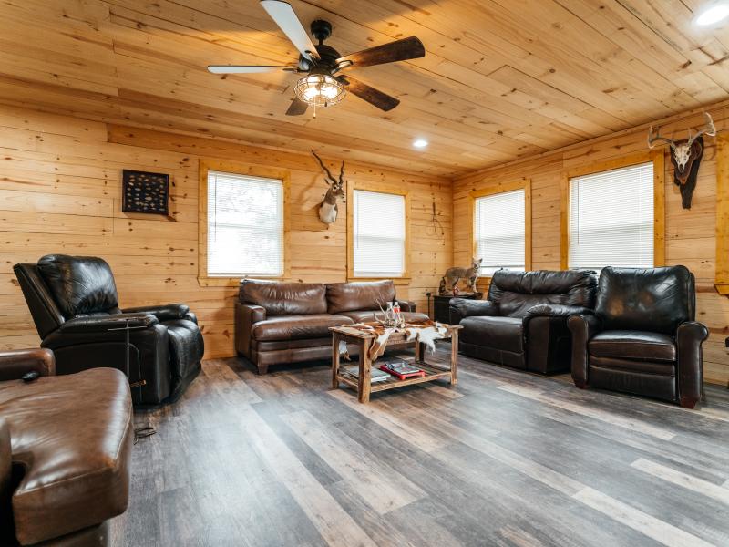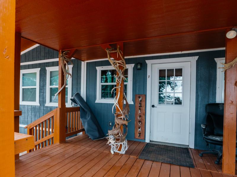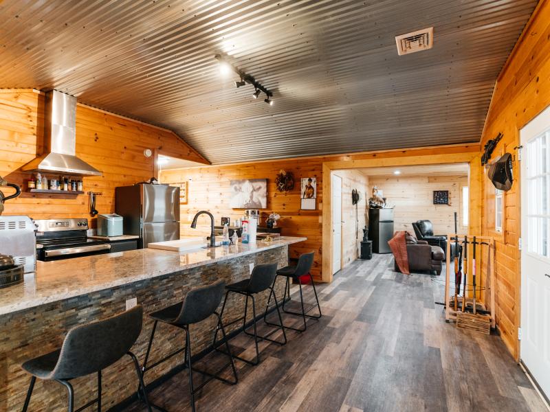 Improvements are thoughtfully designed for both comfort and functionality. The 1,700± square foot lodge features two bedrooms, three bathrooms, and a game room, along with an outdoor kitchen overlooking one of the lakes, creating an ideal setting for entertaining. Additional improvements include a renovated 100-year-old barn with a new roof, a 20x20 covered awning, a Connex storage unit, and a walk-in cooler capable of handling multiple animals.