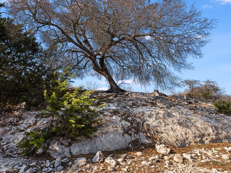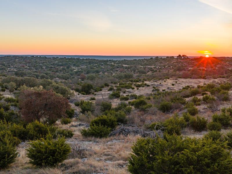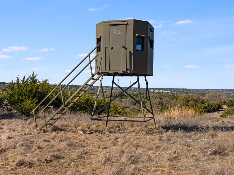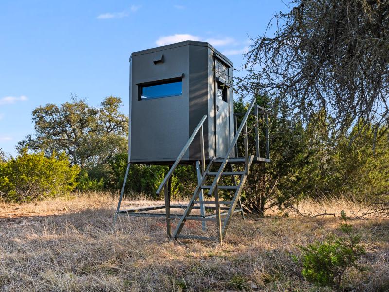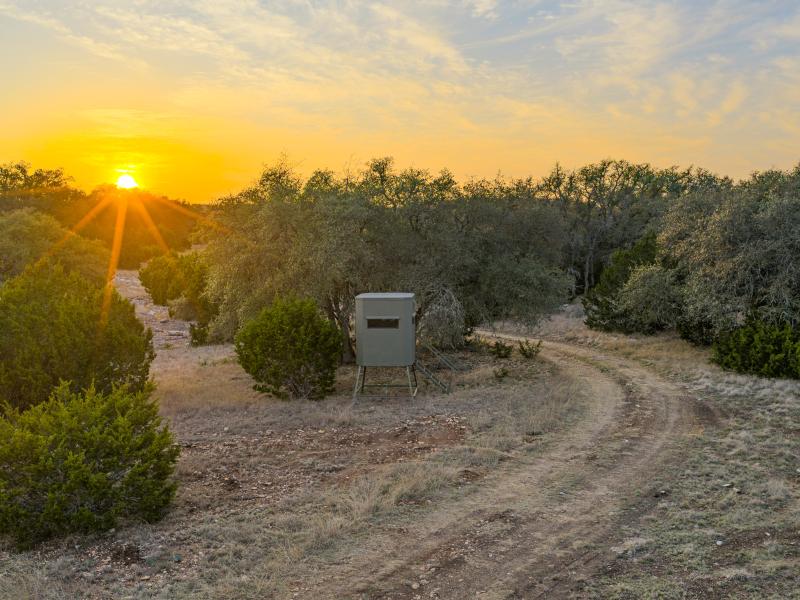 In contrast, the eastern side of the property rises into elevated ridges and dramatic Hill Country vistas, providing long-range views across the surrounding landscape. These high points are perfectly suited for glassing and spotting wildlife moving along the hillsides and canyon edges—an ideal setup for hunters who enjoy scanning terrain and planning strategic stalks.