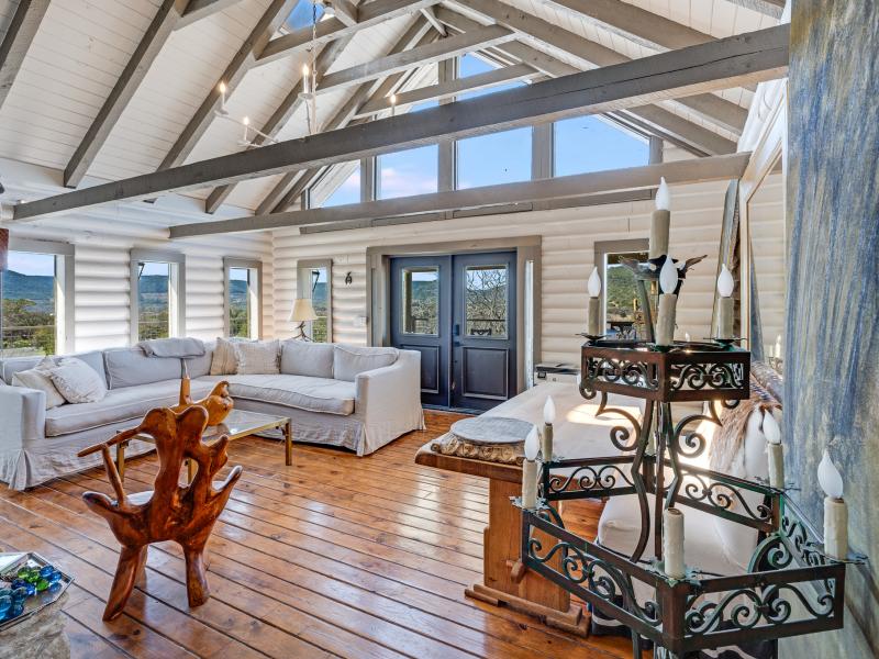 Thoughtfully positioned to capture panoramic views, the fully renovated custom log lodge spans approximately 3,356 square feet across three stories, offering 4 bedrooms and 3.5 bathrooms. The home has undergone significant upgrades including new plumbing, HVAC, electrical systems, and a reworked high-pressure water well complemented by a five-stage reverse osmosis filtration system.