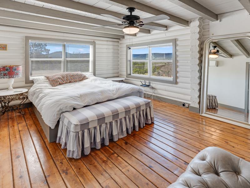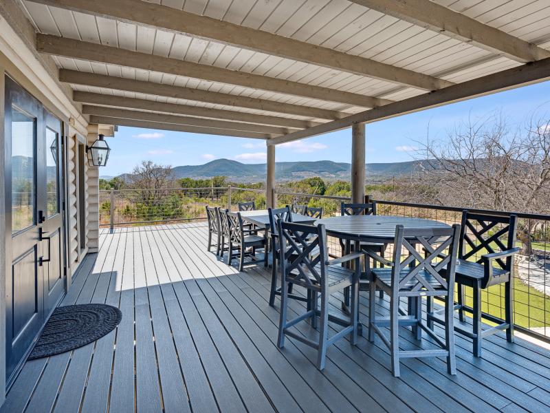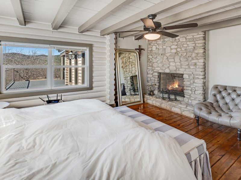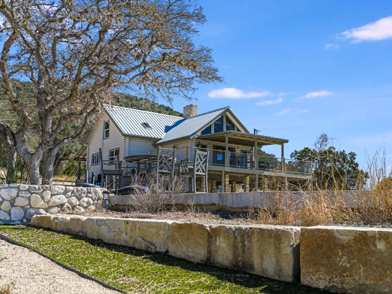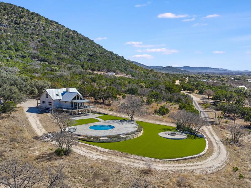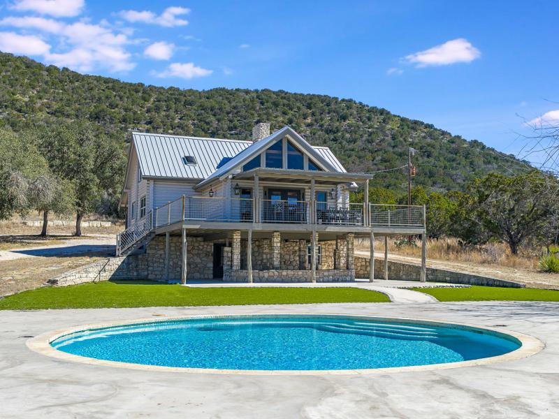 Silent Bluffs Ranch spans 42± acres just outside Leakey in the heart of the Texas Hill Country. Privately positioned at the end of the road, this remarkable unrestricted ranch estate features a custom 4-bedroom, 3.5-bath lodge that immediately sets itself apart with soaring vaulted ceilings, massive exposed beams, and an inviting lodge-style atmosphere designed for both relaxation and entertaining. Two interior fireplaces create warm, refined gathering spaces while expansive windows frame sweeping western views that stretch endlessly across the surrounding mountains.