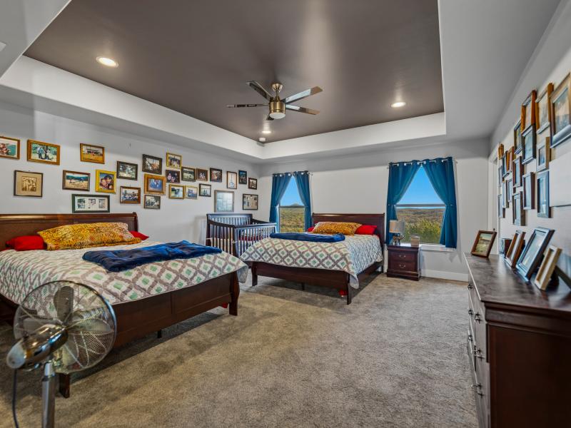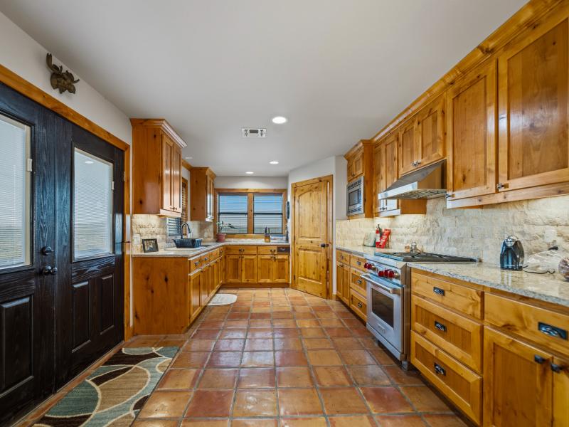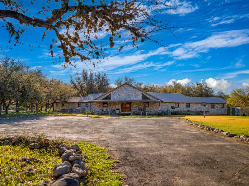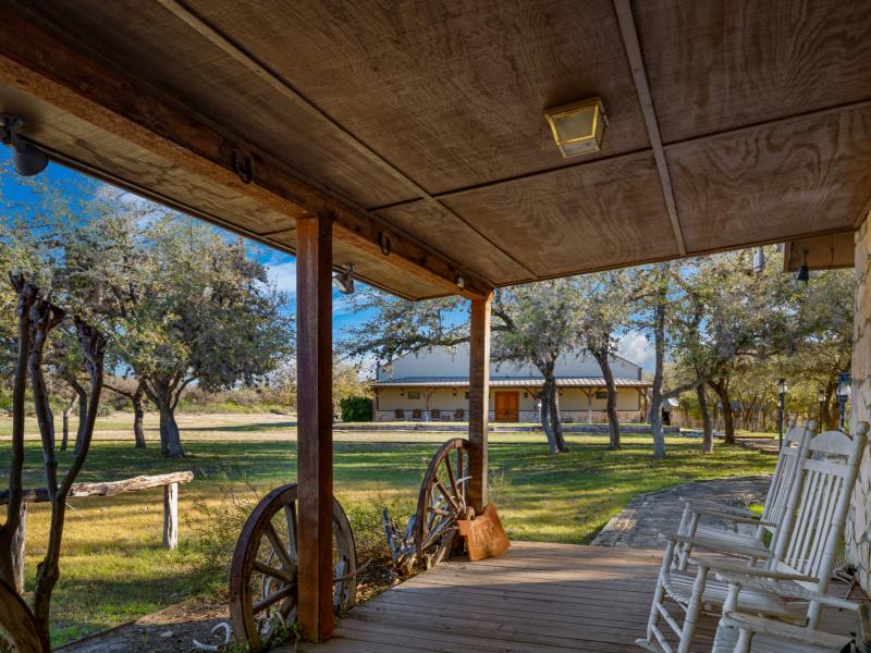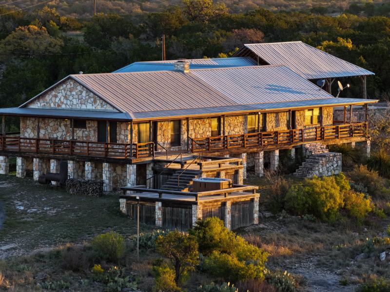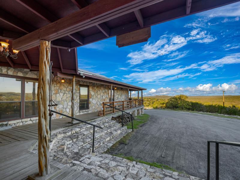 Positioned at approximately 1,760 feet in elevation, the home captures sweeping panoramic views of the ranch. Wraparound porches and multi-level outdoor spaces invite quiet mornings and expansive sunsets, while a paved road—stretching roughly 3,373 +/- linear feet—provides smooth access to the home.