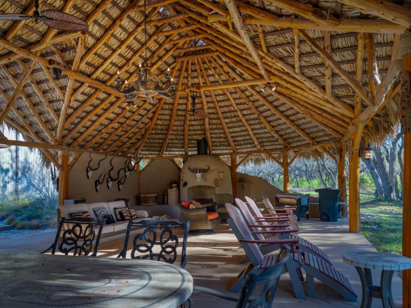 Just beyond, an African-style gazebo with a palm-thatched roof and stucco fireplace overlooks a hardwood-lined seasonal creek—an ideal setting for unwinding after a hunt.
