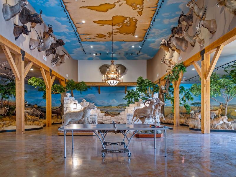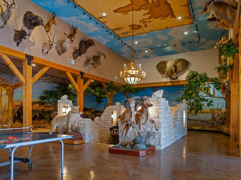 Perhaps most striking is the African-inspired trophy room, complete with an in-ground wine tasting circle, hand-painted ceilings, and an extraordinary collection of mounts representing species from across the globe.