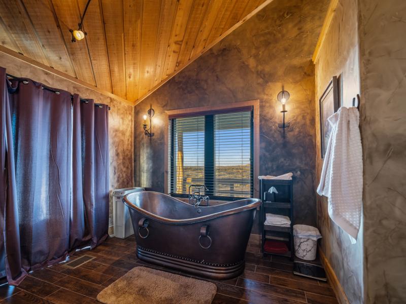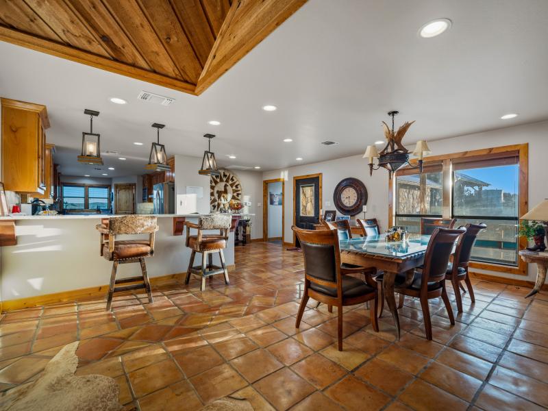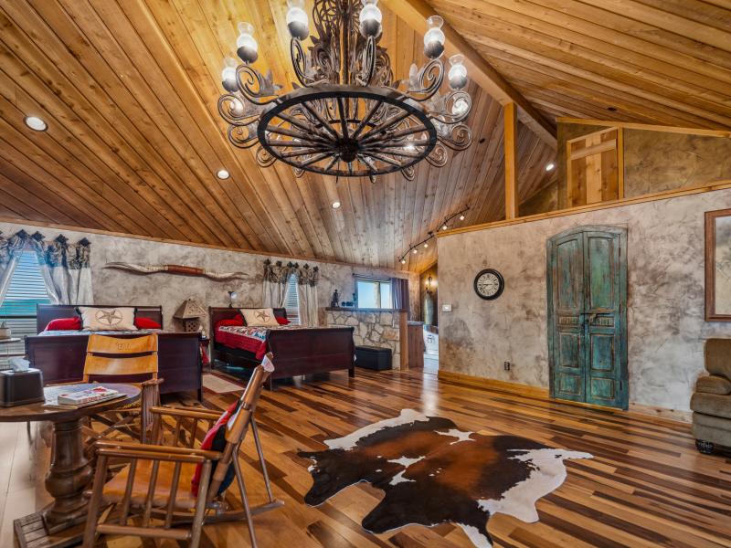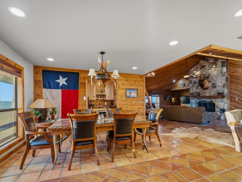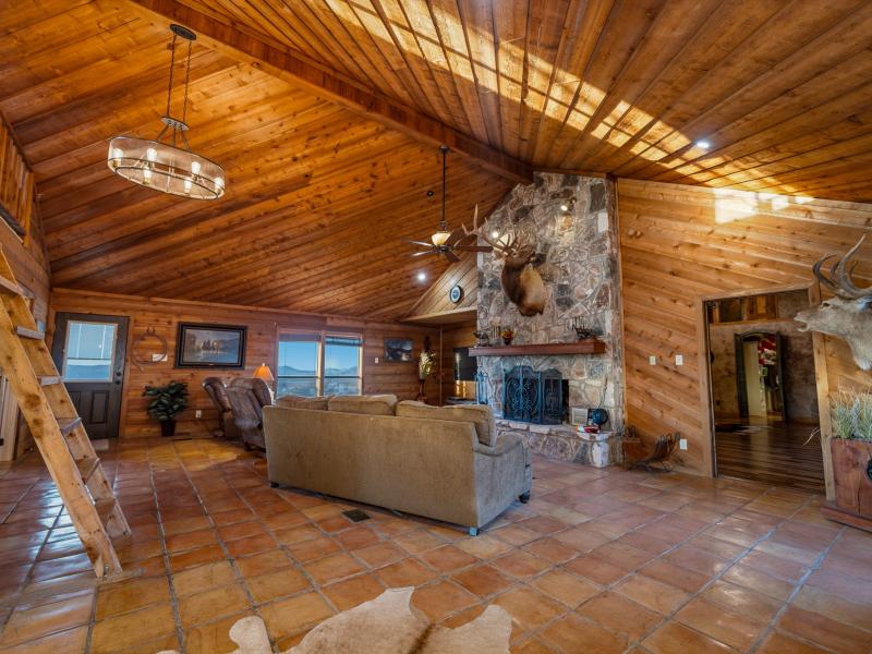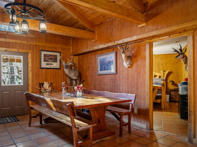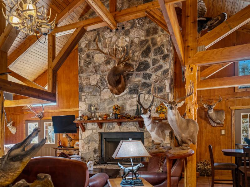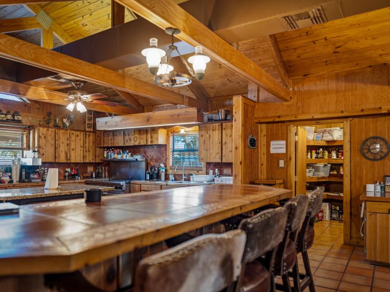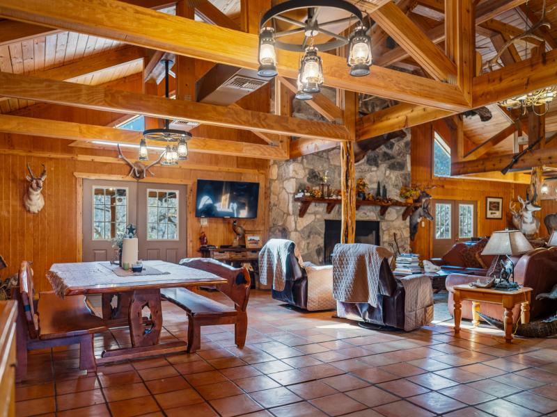 The main lodge serves as the social and operational heart of the ranch. Featuring 9 bedrooms and 4 bathrooms, the structure blends rustic character with functional luxury. Towering vaulted ceilings with exposed wooden beams frame the space, while a historic stone fireplace anchors the main living area.