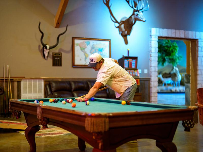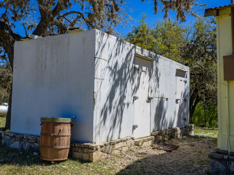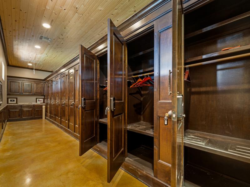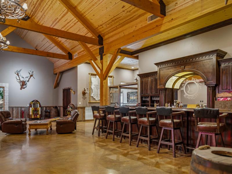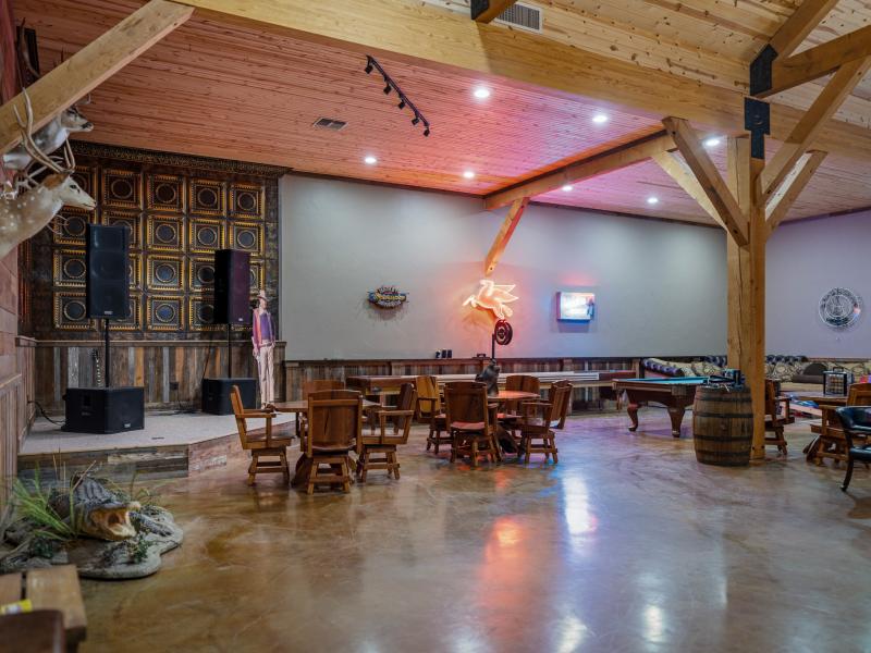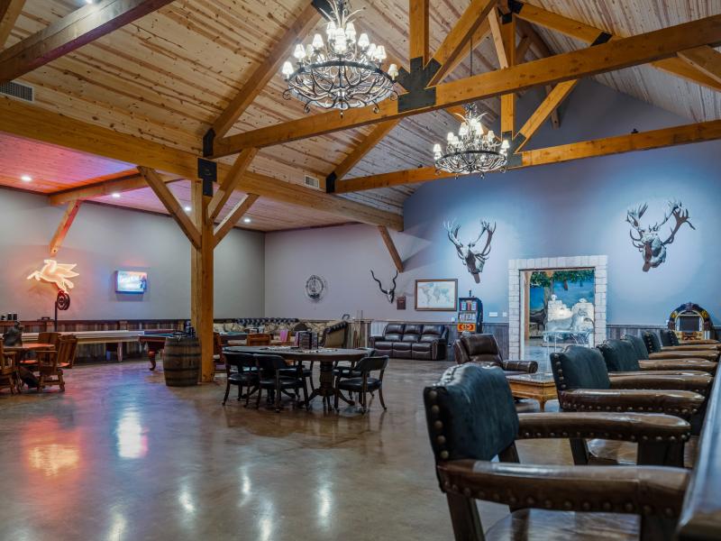 Inside, 16 custom lockers provide secure storage for hunting gear, reinforcing the ranch’s turnkey functionality. A historic custom bar, lined with televisions, anchors the space, while a raised stage allows for live entertainment.
