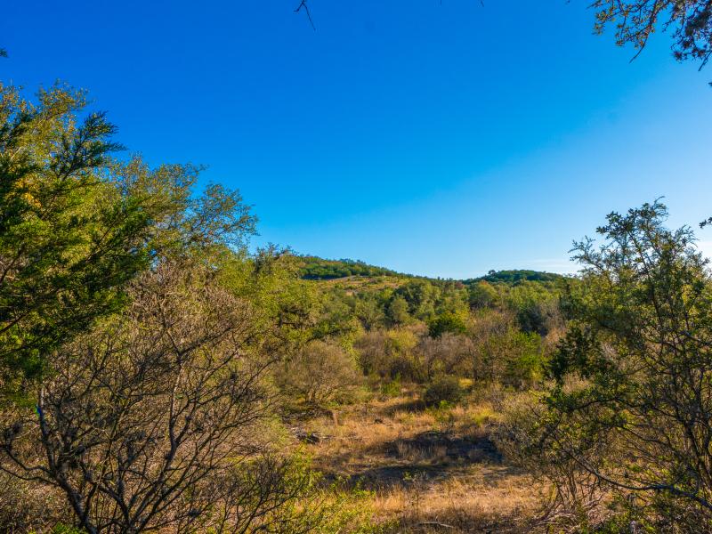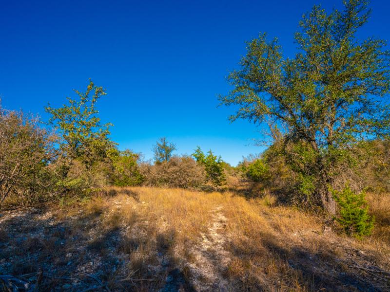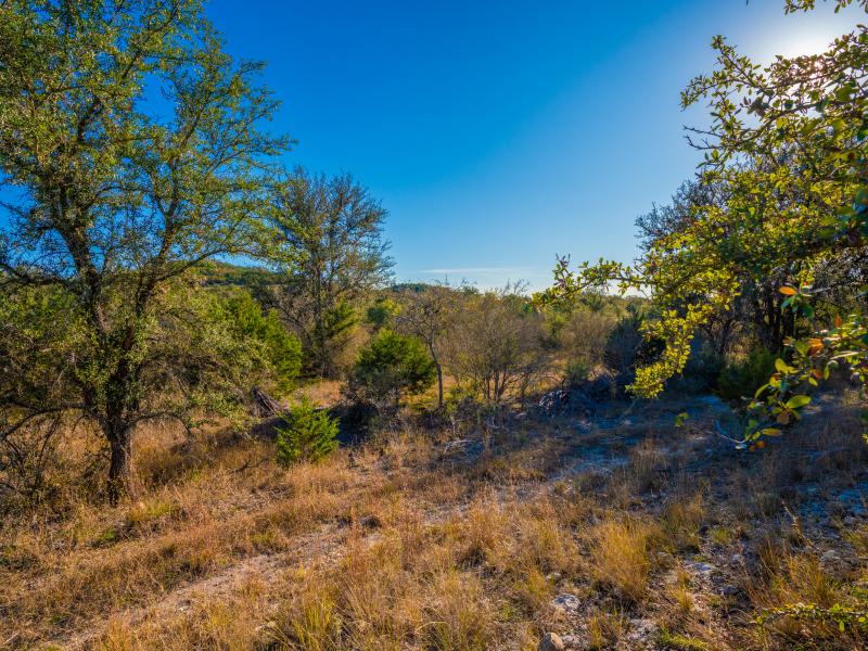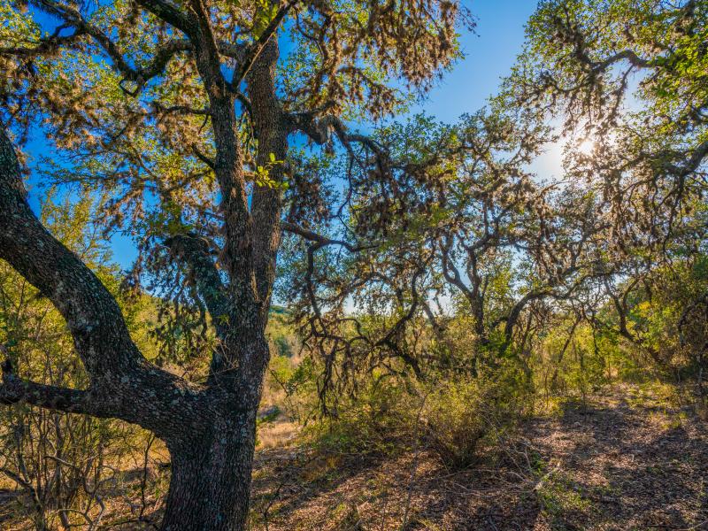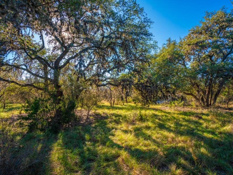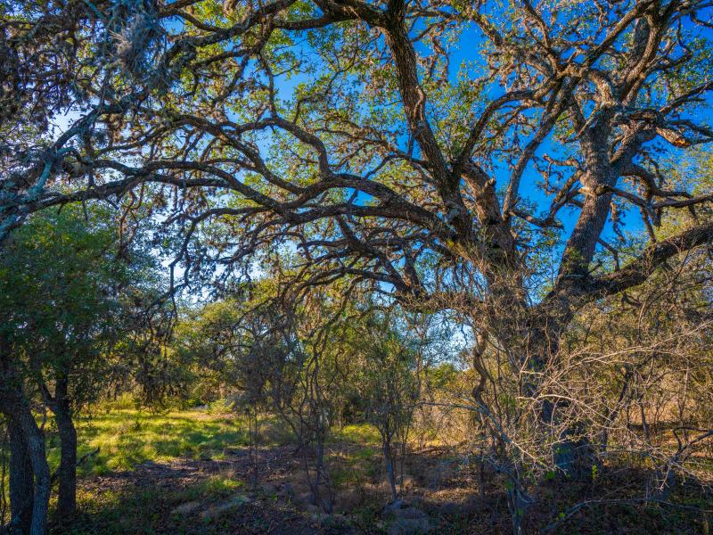 The land showcases classic Hill Country character with rolling terrain, mature hardwoods, and dense native brush that provide both scenic beauty and excellent wildlife habitat. Towering cypress, oak, and native vegetation create shaded building sites and panoramic views across the surrounding countryside.