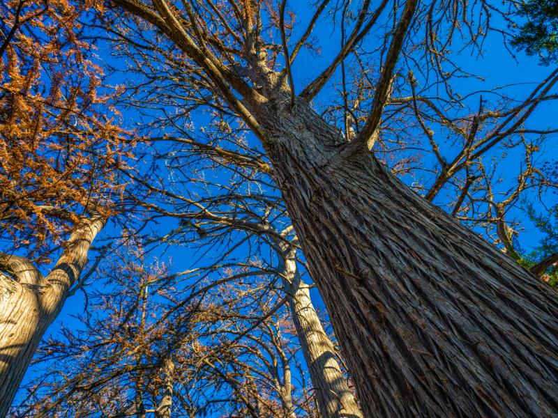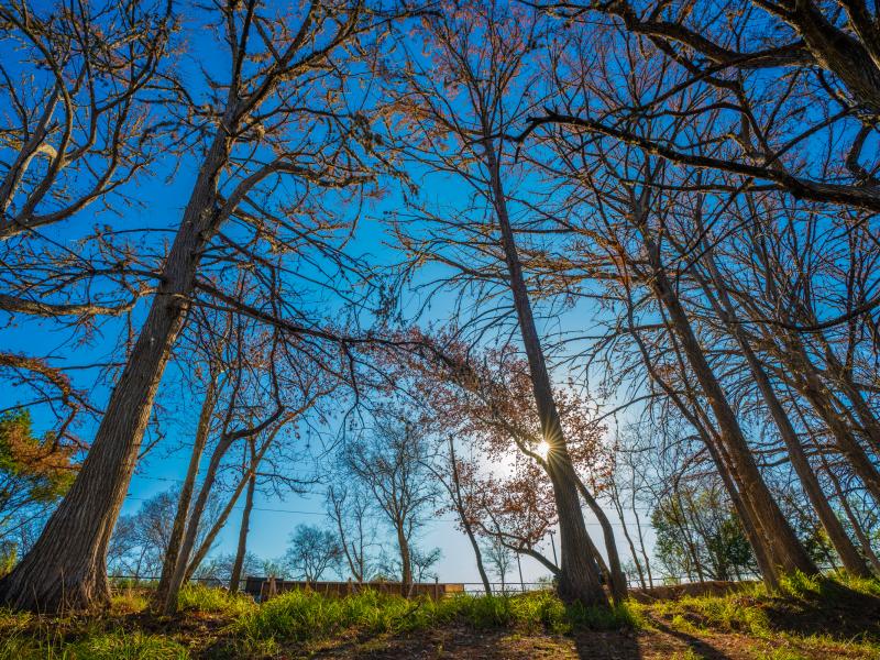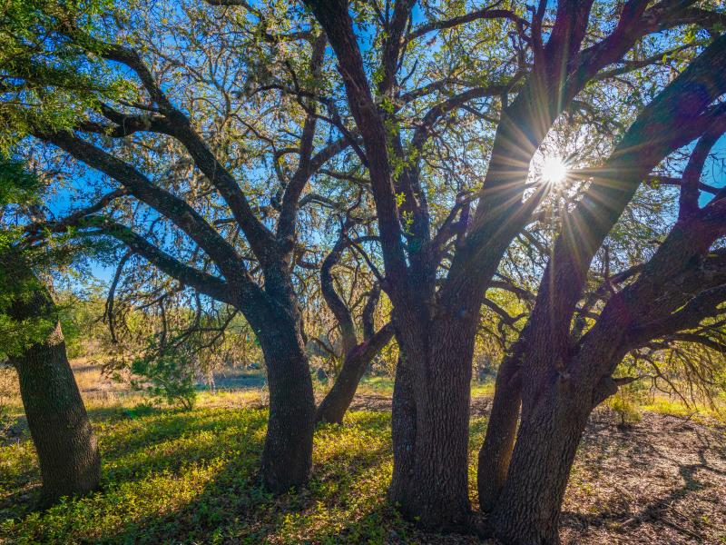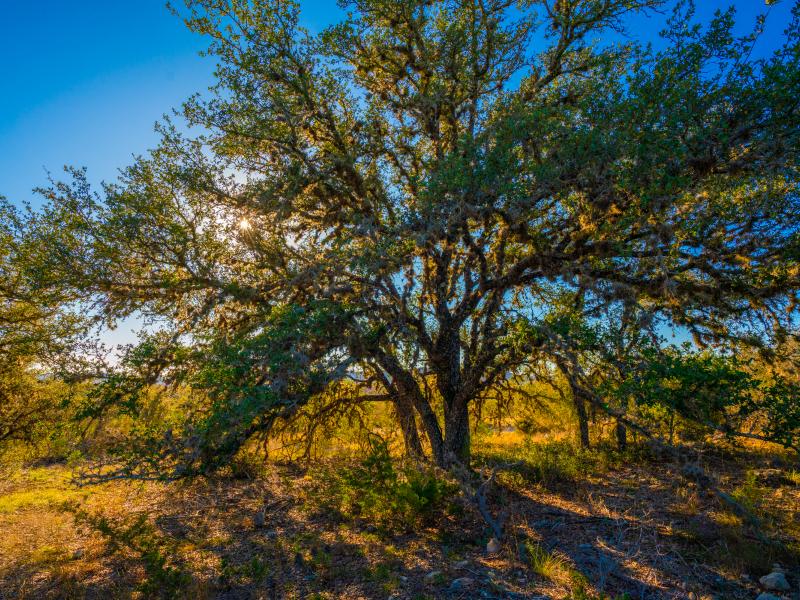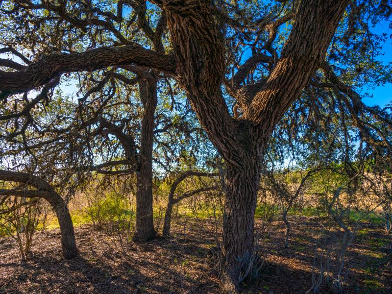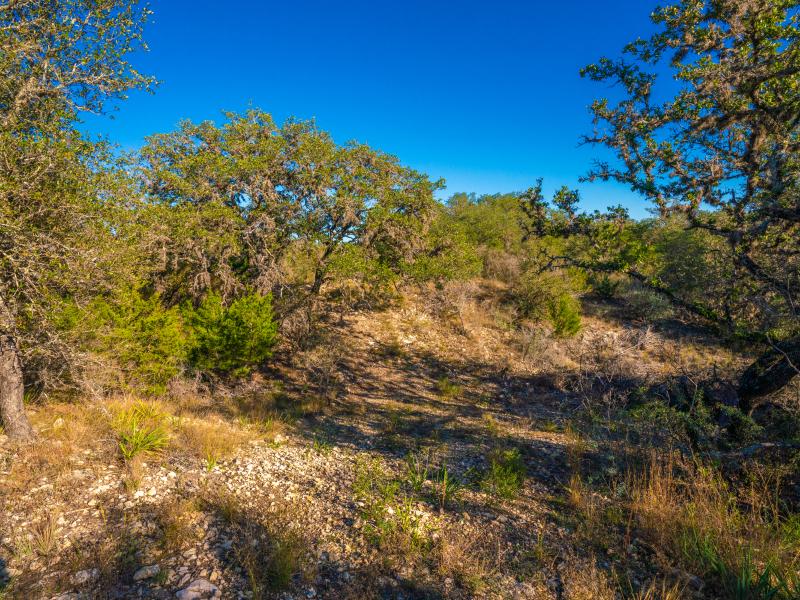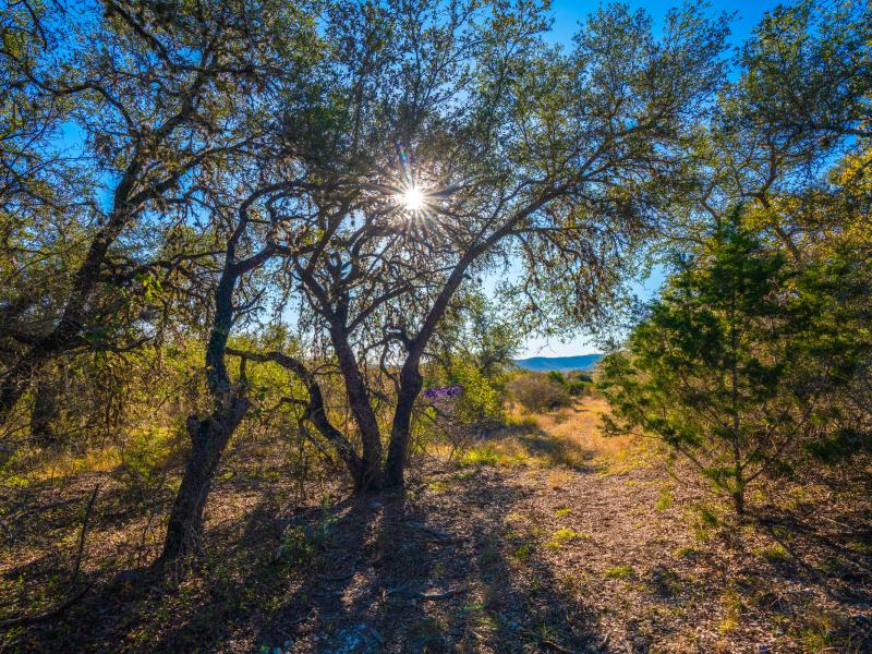 The land showcases classic Hill Country character with rolling terrain, mature hardwoods, and dense native brush that provide both scenic beauty and excellent wildlife habitat. Towering cypress, oak, and native vegetation create shaded building sites and panoramic views across the surrounding countryside.