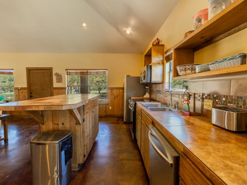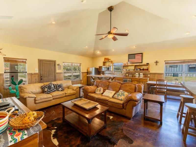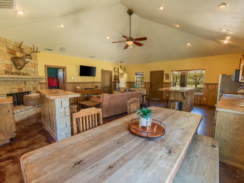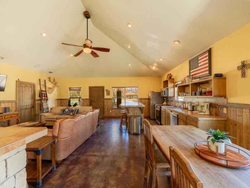 The open-concept living area is filled with natural light, enhanced by large windows that frame the surrounding Hill Country landscape. The layout allows for seamless flow between the kitchen, dining, and living areas, making it well-suited for entertaining and gathering.