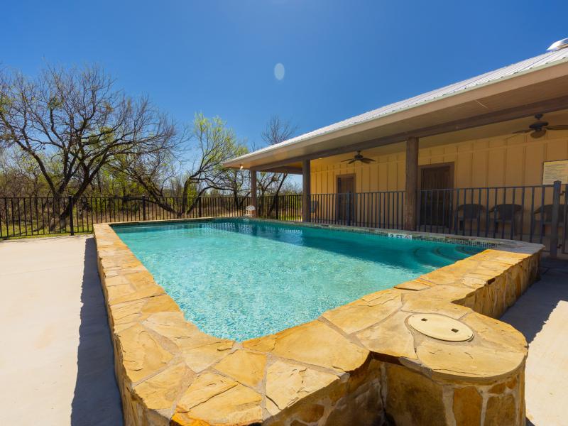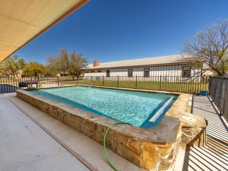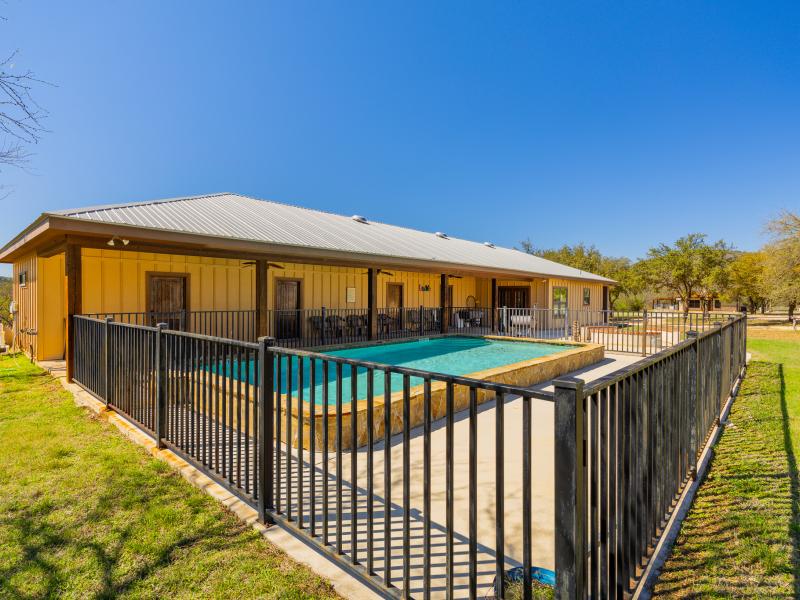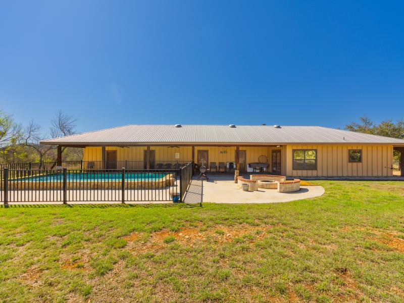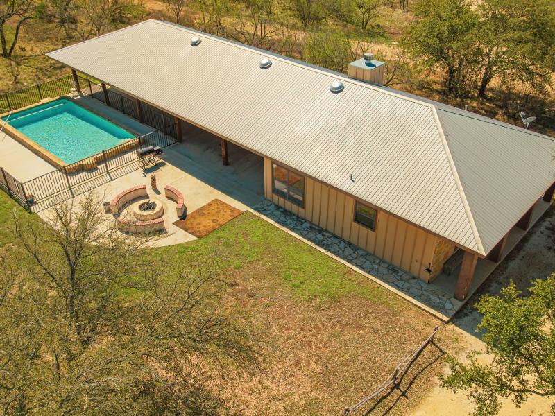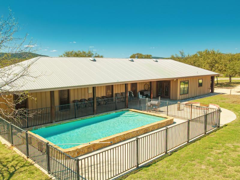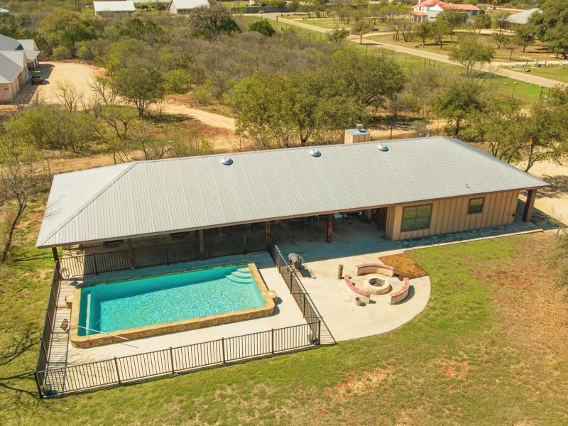 The property offers a true outdoor retreat, featuring a private pool, expansive outdoor living areas, and elevated views of the surrounding Hill Country terrain.